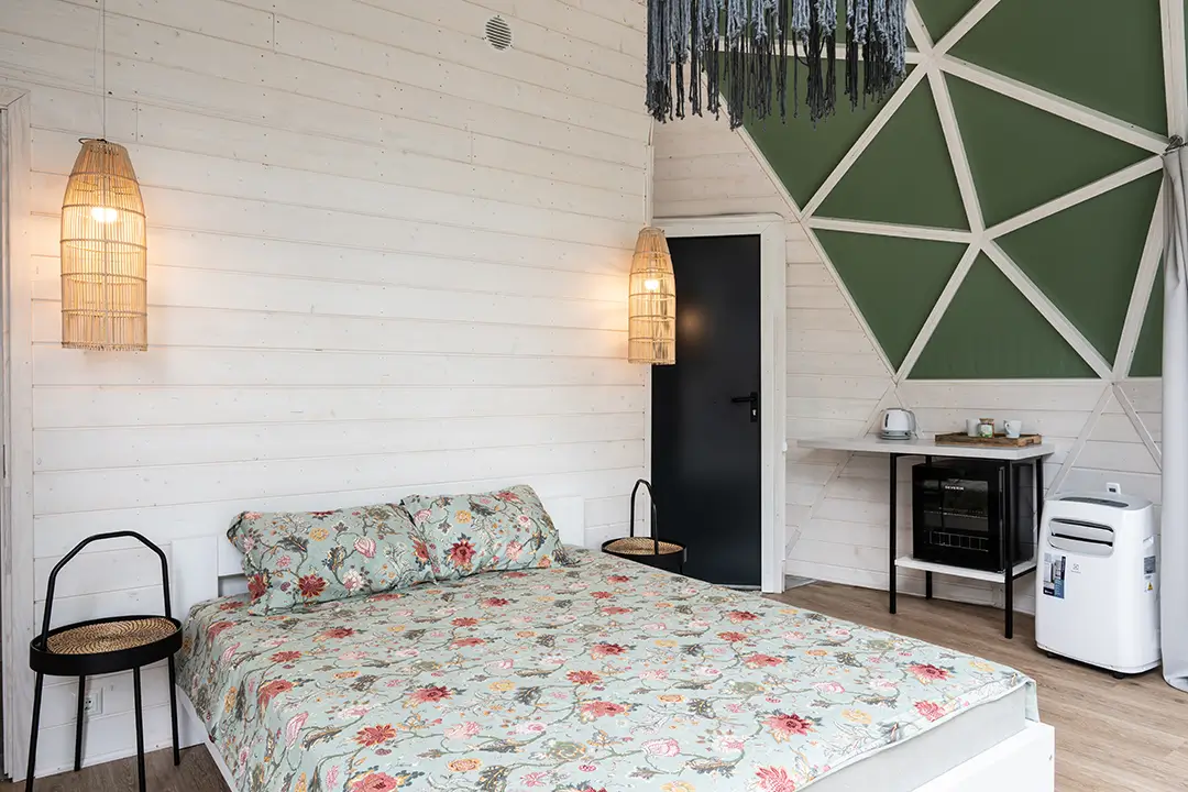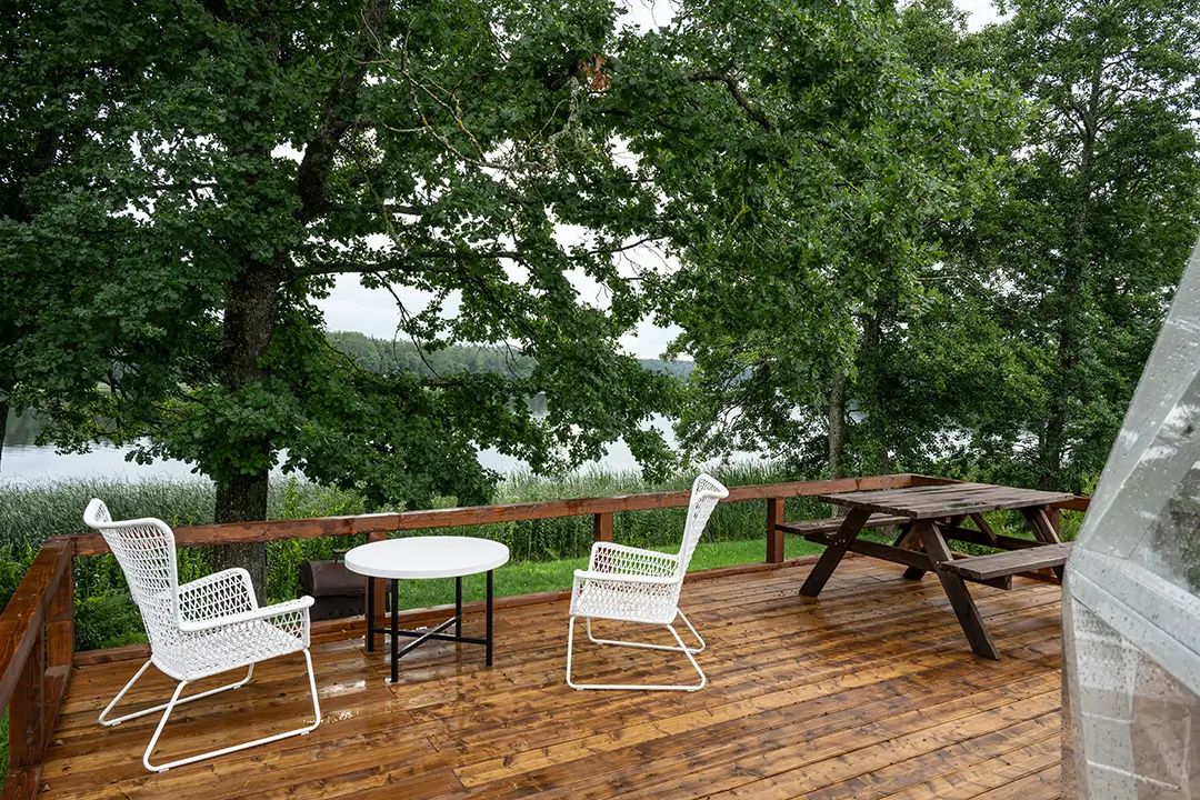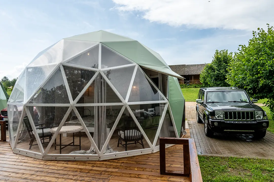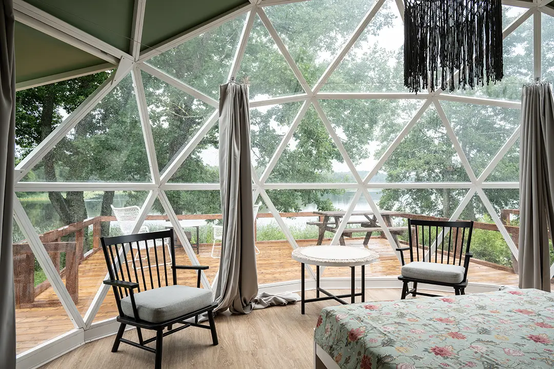 Zwei doppelte, möblierte Kuppelhäuser am Seeufer.