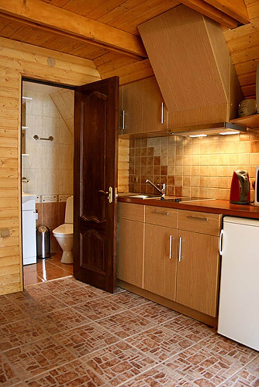 - Virtuves zonā nepieciešamie trauki, ātrvārāmā krūze, ledusskapis un elektriskā plīts;